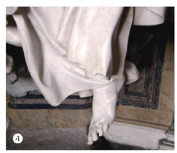 贝尔尼尼要为科纳罗小礼拜堂塑造一组有关圣特雷萨的造像,名为《圣特雷萨的沉迷》(Ecstasy of Saint Teresa)。作为巴洛克艺术家的翘楚,他将这个题材的“戏剧化瞬间”表现得登峰造极。首先,为了营造出类似舞台的灯光效果,他设计让自然光线通过雕塑顶部的一扇天窗直射进来,雕塑背景还加上了金色的光束①。其次,他在雕塑两旁设计了类似剧院中的包厢,把科纳罗主教及亲友安排在包厢内观看表演,给人以彻头彻尾的“剧场感”②。位于“舞台”正中的是身体悬浮于云朵间神情沉迷的圣特雷萨,和正要将金箭刺向她的天使——又是事件发生的“关键瞬间”。只见圣女双目微合,半张的嘴仿佛正在轻叹③,再加上紧收的脚趾④,精准地刻画出了既“痛楚”又“狂喜”的表情。