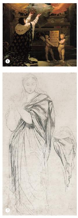 画中的路易十三侧跪于圣坛之下,手捧象征皇权的王冠和权杖奉献给圣母,旁边站立着两位小天使,抬着写有誓言的金板①。圣坛之上,怀抱耶稣的圣母坐于云端,天使们环绕四周。安格尔在画草图时,本来是圣母一人站立在圣坛上的②,后来才添加上了小耶稣,大概是为了象征天主教和新教的和谐共处。