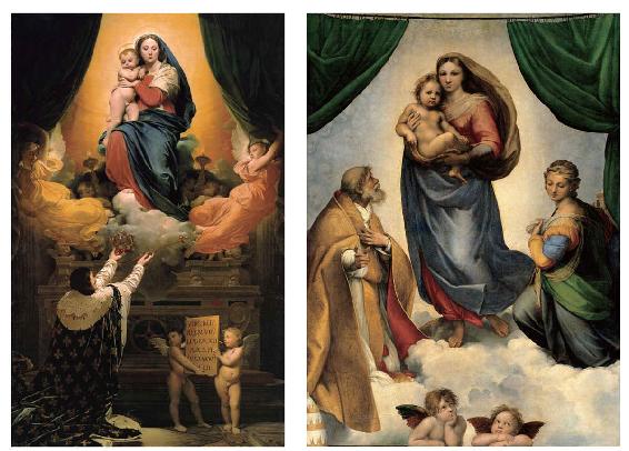 《路易十三的誓言》(左)借鉴了拉斐尔的名作《西斯廷圣母》(右)