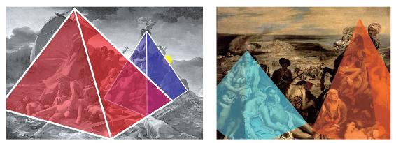 籍里柯的《梅杜萨之筏》(左)和德拉克洛瓦的《希阿岛的屠杀》(右)都采用了“双金字塔”式构图