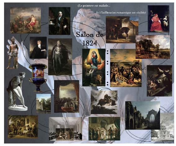 1824年的沙龙展可以称得上是盛况空前,宣传目录上就收录了2567件作品。除了法国的格罗(Antoine-Jean Gros)、德拉罗什(Paul Delaroche)、吉罗代(Girodet de Roussy-Trioson)等名家之外,英国的康斯坦布尔(John Constable)也携名作《干草车》(The Hay Wain)来巴黎参展。