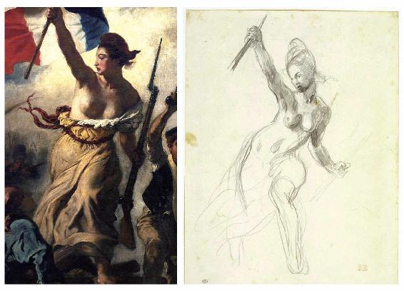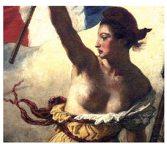 那么,他如何在没有第一手素材的情况下塑造画中人物呢?其实,“光荣三日”事件最为打动他的不是具体的人,而是“信念”——自由、平等、博爱(Liberté,égalité,fraternité)的信念!这种信念如同一个神祇,只有神祇才值得巴黎市民宁死守护,没错,是神祇,德拉克洛瓦创作的是一个为自由、平等、博爱而战的女神形象。