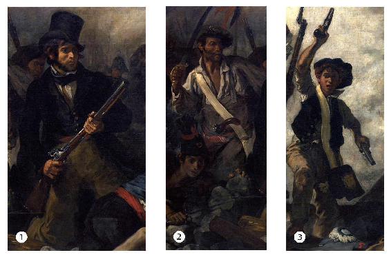 他们代表了不同年龄、背景和社会阶层的起义者。女神左边的是一位身着西装的绅士,代表着受过教育的中产阶级①。绅士左边挥舞军刀头戴贝雷帽的男士则代表着工人阶级。他的下方,匍匐着一位头戴法国步兵军帽的男孩,正用石头修筑街垒——可以推断军帽和短刀都是缴获来的②。女神右边是一位手持双枪的少年,学生装束,斜挎的背包上还隐约可见其校徽③。维克多·雨果被这个形象激发出灵感,在其描绘两年之后另一场革命的小说《悲惨世界》中,他以画中的男孩为蓝图,塑造出了加弗罗什(Gavroche)这一形象。以上四位的形象均来源于查理特其中一幅版画中左侧的人物④。