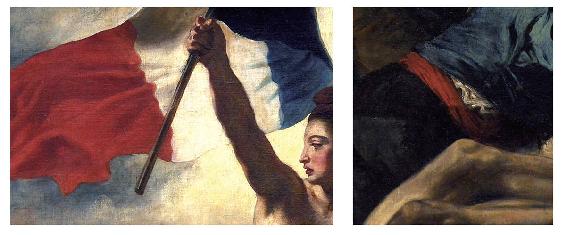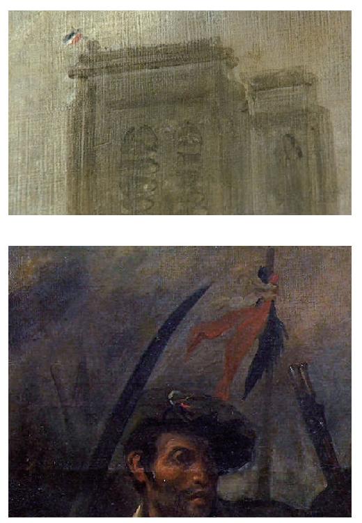 作为注重色彩的画家,德拉克洛瓦在这幅画作中毫无例外地突出了这一点。他多次运用令其热血沸腾的三色旗的颜色来暗喻“自由、平等、博爱”的信念。背景处硝烟中的巴黎圣母院顶部,也飘扬着画家亲眼所见的三色旗。