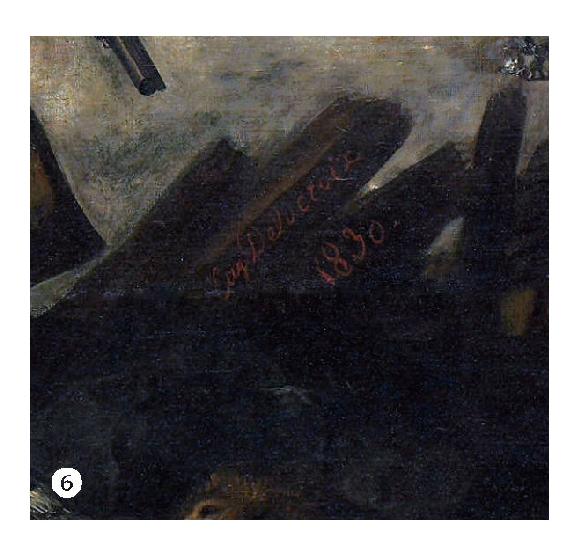 位于画作下部的是三具死尸,两具身着法国皇家卫队制服,一具半身裸露,疑似起义者⑤。尸体四周堆满了砾石和碎木,据目击者的描述,起义方将街道铺设的石块撬起,还推来马车和家具,用以堆建街垒。画家在其中的几段碎木上留下了绘画创作年代和画家自己的签名⑥。