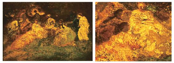 另一位两人为之争吵不休的是蒙提切利(Adolphe Monticelli),他是同时代法国画家中偏年长的,以“厚涂法”而闻名。厚涂法(Impasto)在意大利语中也称“面团”,顾名思义就是用很厚的颜料涂抹在画布上,并在画布上形成鲜明的笔触。厚涂法对成就梵高的绘画技法至关重要,但高更在私信中就言明:“梵高尊崇蒙提切利的厚涂法,这种无序的走笔是我最为厌恶的。”