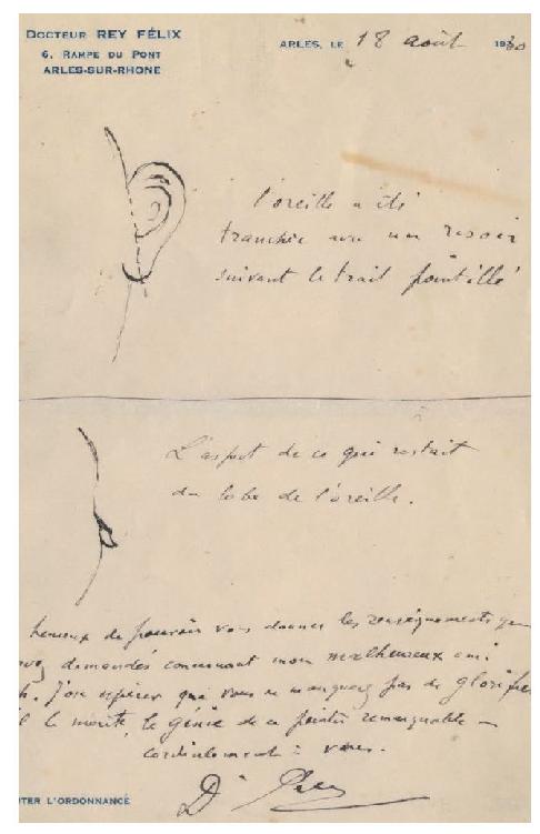 2016年,一位居住在阿尔的爱尔兰女作家贝纳黛特·墨菲(Bernadette Murphy)出版了一本叫作《梵高的耳朵》(Van Gogh's Ear:The True Story)的新书,揭示了她耗时7年的研究成果。她好不容易找到了《渴望生活》的作者欧文·斯通的档案材料,发现欧文·斯通于1930年采访了当时唯一活在世上的当事人——为梵高处理伤口的雷伊医生(Félix Rey),并请医生亲手画出了梵高的耳伤图(现存梵高博物馆)。该图证实了被切掉的是梵高的整个左耳。