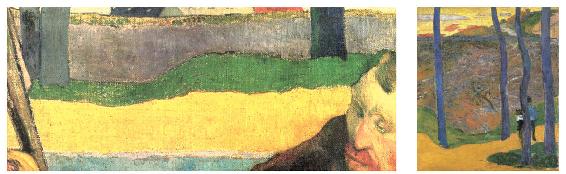 画作右侧的梵高面带倦容,俯视下方,左侧肩膀到臂部处于画幅之外。画作左边有一丛摆放在蓝色花瓶中的向日葵,花朵正好完全遮挡住了梵高的画板,让人看不到他的画。是不是高更借此隐喻梵高始终无法脱离客观现实,缺乏艺术的创造?背景是一幅放大尺寸的画作,很可能是高更自己的作品《蓝树林》的一部分。是不是高更自以为是地暗示他给梵高带来了启迪?由于两人都没有在信中提及相关内容,这些也只是凭空猜测罢了。