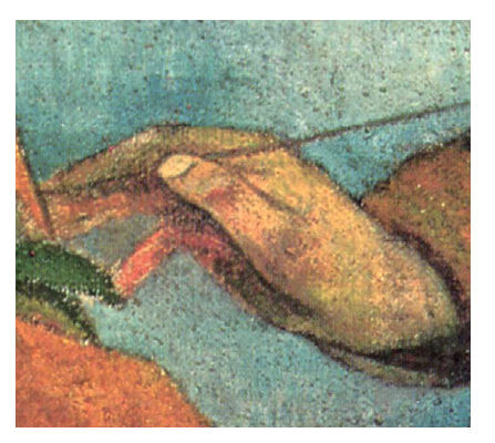 画中最为生动的是梵高持笔的右手。高更在晚年回忆梵高时,还专门提到过这双“白净而灵巧”的手。然而,梵高在第一眼看到这幅画时,脸上立即失去了笑容。他眉头紧锁,呼吸急促,一阵沉默后大声怒吼道:“这就是我?疯了的我吗?”于是两人又爆发了前所未有的冲突。