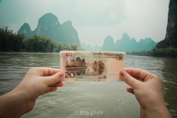 漓江倒影之美,数“黄布倒影”最为迷人:船过画山,江面开阔,水平如镜,青峰倒影,美不胜收,“分明看见青山顶,船在青山顶上行。”新版人民币20元背景图案-黄布倒影正是取自此景。9月在这儿拍摄日出最美。