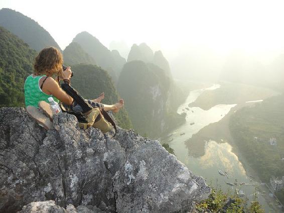 上月亮山,爬到台阶的尽头能看到近处的月亮岩,俯瞰整个阳朔的山峰,景色很美。尤其太阳下山时分,山脚会缠绕一团烟雾,如仙境般美轮美奂。