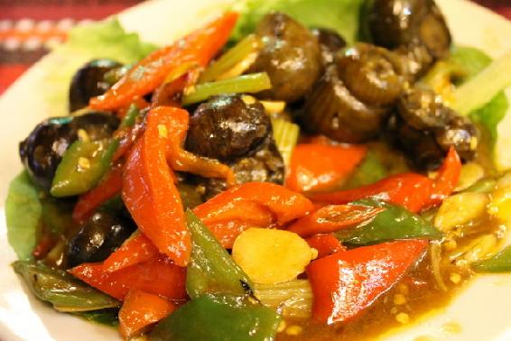 桂林典型的风味菜,以桂林漓江里的河虾为原料加入少许桂林三花酒爆炒而成。菜肴色泽鲜红如宝石,口感酥脆嫩爽,香而不浓,从中尚可品尝出漓江水的清纯与甘甜。