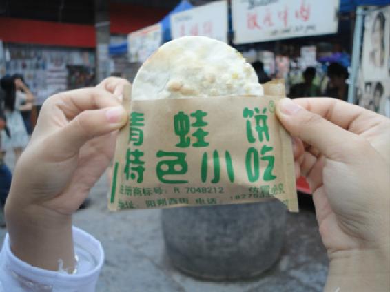 在西街口,只在下午接近傍晚时才出摊。售卖的青蛙饼并非以青蛙做馅儿,只是用翠绿的芭蕉叶包裹的饼形状如青蛙大嘴。打着“不好吃可拒绝付款”的招牌。人气很旺。