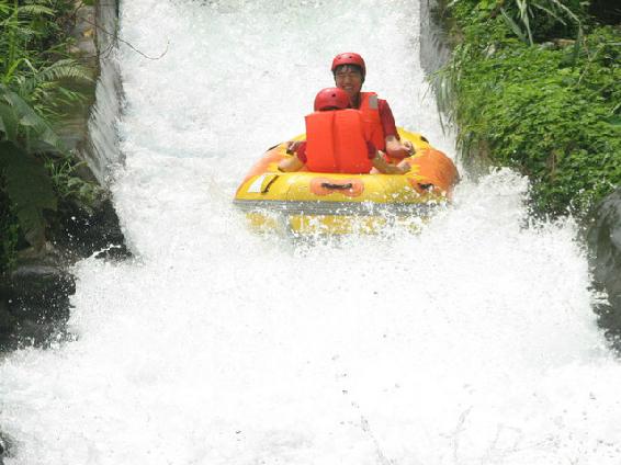 没来之前就听很多人说起最开始漂出去的那个人工坡落差13米很恐怖,至从两年前有十二滩漂流、龙脊峡漂流的经验,我深有体会。如果你想感受下落时的刺激,就一定要选择背对闸口,当艇下落的那一瞬间,让你除了尖叫,还是尖叫,这比户外拓展那个背摔可刺激多了。看了一下提示牌:落差13米,天啊!直冲下去我们会不会晕头转向啊,管不了那么多了,周围游客各个都兴奋至极。还没等大家回过神来,橡皮艇就接二连三地冲下13米的闸口,一股大浪无情亲吻着我们,一阵清凉,浸入身体。我双手紧紧抓住皮艇两边的把手,在激流中犹如一叶扁舟被水流冲的到处乱窜,我几次脱手,还好有惊无险。全程漂流完之后,一走出橡皮艇,有种劫后余生的感觉,很奇妙,我居然对这惊心动魄的漂流流连忘返。这里确实是不可多得的漂流好去处。
