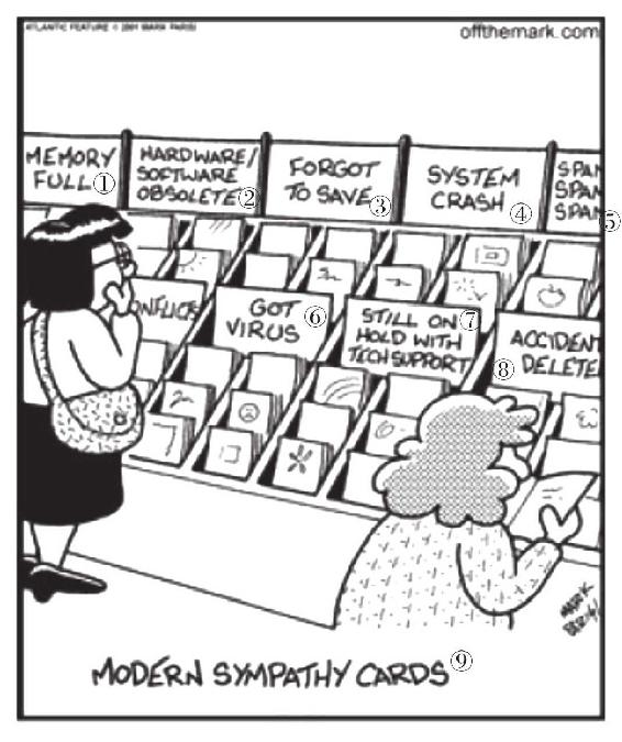 ①内存已满 ②硬件/软件过期 ③忘记保存 ④系统崩溃 ⑤垃圾邮件 ⑥中毒 ⑦技术处理中 ⑧意外删除 ⑨现代吊唁卡
