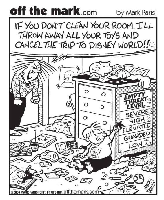 ①“你要是不把房间清理干净,我就把你的玩具都扔掉,也不带你去迪斯尼乐园了!” ②虚张声势的程度 ③极其严重 ④严重 ⑤有点严重 ⑥需要注意 ⑦忽略