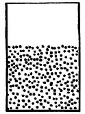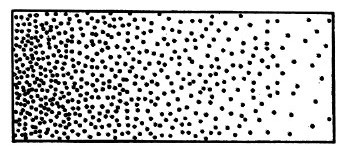 与布朗运动十分相似的是扩散现象。在一个装满清水的容器中,溶解少量的高锰酸钾,并使得容器内的浓度不同,如图4所示,小点代表高锰酸钾分子,从左至右浓度逐渐降低。这个时候,你若弃之不理的话,容器中就开始了缓慢的“扩散”现象。高锰酸钾将从左向右散布过去,从高浓度向低浓度散布,直到均匀地分布在容器中。