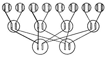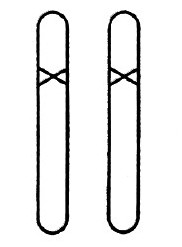 隐性突变的概率有时甚至比显性突变要大,尽管它在突变开始发生的时候不明显,但它们的重要性是不言而喻的。只有两条染色体上都发生了隐性突变,才会影响到模式的改变(图10)。两个等同的隐性突变相互杂交或一个突变体自交时,就会产生这样的个体;在雌雄同体的植物那里这种情况是经常发生的,甚至是自发产生的。在这种情况中,可以观察到有隐性突变的模式在后代中约占四分之一。