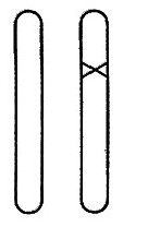 一条染色体在其自身所在区域内发生突变是可以被我们直接观察到,并得以确认的。与这条染色体的变化相比较,同源染色体的对应位置上没有发生一点变化(图8给出了示意图,×表示突变的位置),这一点是十分重要的。通常在后代中有一半的突变体性状可以直接显现出来,另一半则保持正常没有变化,这刚好证明了在突变个体与非突变个体的杂交中一条染色体受到突变的影响,而另一条染色体没有变异。这和理论的预期一样,证明了是突变体发生减数分裂时两条染色体互相分离的结果——如图9所示。这个图是一个“谱系”,一对染色体表示了三代连续的个体。如果个体的突变体的两条染色体发生突变的话,那么其子女全会得到相同的遗传性——与他们的父本、母本都不相同。