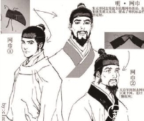 明代男子对头巾的崇尚程度,超过了以往任何时代。在这200多年间,先后出现的头巾款式,不下三四十种。网巾是明代男子用于束发的一种网罩,不分尊卑贵贱,均可用之,通常以黑色丝绳、马尾或棕丝等编成。平时家居可露在外面,有官者外出,则在网巾上加戴冠帽。这种网巾出现在明初,相传是经明太祖朱元璋“钦定”而颁发全国的。一天,朱元璋微服出行,走到神乐观前,见一个道士正在灯下编织网巾。朱元璋问:“此何物也?”道士答道:“此为网巾,用以裹头,则万发俱齐。”刚刚当上皇帝的朱元璋听了“万发俱齐”这句话非常满意,马上将这个道士封官并将网巾颁布于天下,令满朝文武、全国百姓都用此巾来罩发。