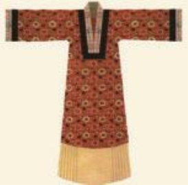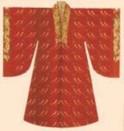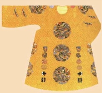 裳十二章的衮冕服饰外,还有乌纱折角向上巾、龙袍、束带,以金、玉、琥珀、犀间为饰,足着软靴的常服。龙袍(图1-91)是明代诸帝的服饰,分两类:第一类是明初的帝服,白纱中单,盘领窄袖,黄绫袍饰龙补子于胸前;第二类为明中、后期的帝服,绛色中单,盘领大袖以黼纹饰领,胸前的龙补子为坐龙形式,上下左右饰以团龙,分在两肩、两侧、腹、背部位,龙袍下侧饰有宗彝、火、藻、粉米、黼、黻之章。