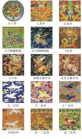朝臣官吏朝服为梁冠、赤罗衣、白纱中单,以青色饰领缘,赤罗裳、青缘,赤罗蔽膝,大带用赤、白二色绢,革带佩绶,白袜黑履。官职品级主要区别在冠的梁数、革带的饰别与执笏的质料上,凡一品冠七梁(公、侯、伯官等级加笼巾、貂蝉、立笔),革带用玉,绶用绿、黄、紫、赤云风四色花锦;二品冠六梁,革带用犀,余同一品;三品冠五梁,革带用金,绶鹤花锦;四品冠四梁,革带用金钑(sà)花,余同三品;五品冠三梁,革带用银钑(sà)花;六品、七品冠二梁,革带用银,御史加獬豸(xiè zhì)冠;八品、九品冠一梁,革带用乌角。所执的笏(hù)板(图1-92),一品至五品质用象牙,六品至九品为槐木。朝服只在典祭大礼时服用,一般皆用常服,如常朝执事,平时也可穿。常服以乌纱帽,团领衫,束带,下穿大口裤,足着软靴。洪武二十六年(1393),定职官常服使用补子(图1-93),文职一品为仙鹤,二品为锦鸡,三品为孔雀,四品为云雁,五品为白鹇 ,六品为鹭鸶,七品为溪敇,八品为黄鹂,九品为鹌鹑,杂职为练鹊,风宪官为獬豸。武官一品、二品为狮子,三品为虎,四品为豹,五品为熊罴 ,六品、七品为彪,八品为犀牛,九品为海马。朝服与公服都属礼服。公服为盘领右衽袍,为在京文官每日晚朝奏事及侍班、谢恩、见辞时,在外文官每日清早公坐时服用。一品至四品为绯袍,五品至七品为青袍,八品至九品为绿袍,未入流杂职官,其袍、笏与八品以下相同。袍上的花纹:一品用大科独花,径五寸;二品用小科独花,径三寸;三品用散荅花无枝叶,径二寸;四品至七品用小杂花,四品、五品径一寸五分;六品、七品径一寸;八品以下无花纹。官吏服还定状元服和进士服,状元服有朝冠二梁(朝服时戴)及乌纱帽一顶(常服时用),朝服身穿红罗袍,圆领、白绢中单,披锦绶,蔽膝,执槐木笏一把;而常服则为袍衫,光素银带,下空大口裤,足穿毡袜朝靴。进士服有进士巾,为硬裹软角,形制为顶微平、软展角,领袖缘边以青罗制之,革带色青并饰以黑角,笏用槐木。
