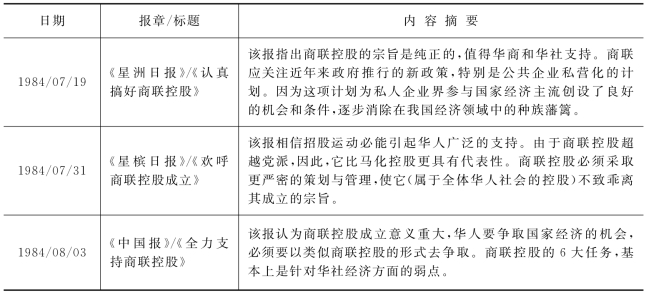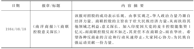 自商联控股宣布公开招股之后,华社舆论几乎一致地持肯定态度,各大报纸纷纷在社论中呼吁华人作出积极的支持。现摘录相关报章社论如表1所示。[6]
