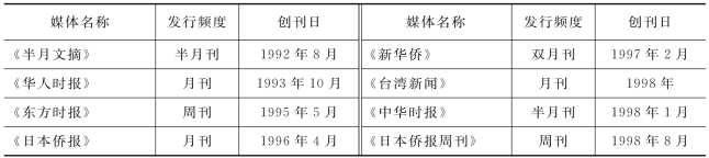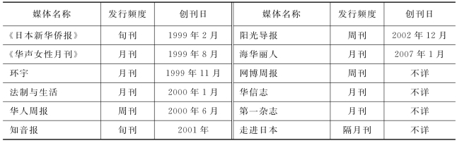 根据中国新闻网(http://www.chinanews.com.cn/hr/yzhrxw/news/2007/08-13/1000865.shtml)、《华侨华人百科全书·新闻出版卷》、《世界华文传媒年鉴》、《在日中国人媒体总览》统计,制作了表1。