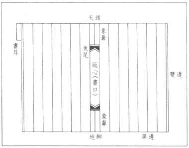中国古籍大都是单面印刷的(除旋风装外),为了便于装订,每一张印页都有一定的格式,也称之为版式[13]。版式是随着书籍装帧形态的变化而变换着形式,不同的朝代、不同的时期、不同的出版单位,书籍的版式有很大的差异,版式总的发展趋势是由简单到复杂,宋代蝴蝶装书所形成的典型的宋版书版式基本上被固定下来,直到清末的线装书[14]