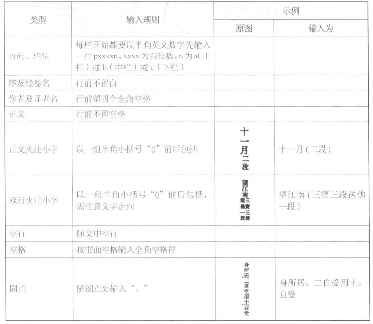 《汉籍全文数字化工作流程指南》中包含一系列加工规范,如“数字图像文件规格”、“数字文件命名原则”、“人工输入规则”(如表3-3所示)、“新增缺字系统”、“通用标记语言”等。
