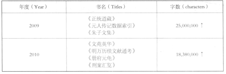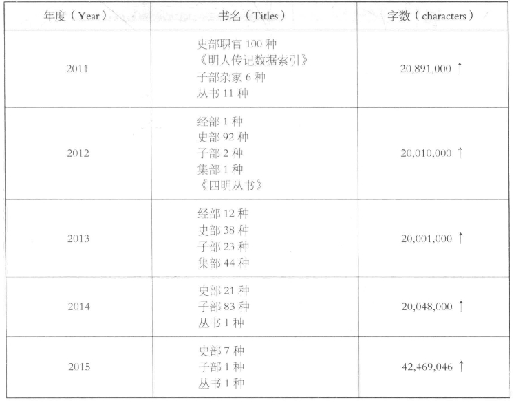 “汉籍全文数据库计划”的建置肇始于1984年,为“史籍自动化计划”的延伸,开发的目标是为了收录对中国传统人文研究具有重要价值的文献,并建立全文电子数据库,以作为学术研究的辅助工具;“汉籍全文数据库”是目前最具规模、数据统整最为严谨的中文全文数据库之一;数据库内容包括经、史、子、集四部,其中以史部为主,经、子、集部为辅。若以类别相属,又可略分为宗教文献、医药文献、文学与文集、政书、类书与史料汇编等,二十余年来累计收录历代典籍已达934种(新增书目),5亿2596万字,内容几乎涵括了所有重要的典籍[5]。数据库新增典籍如表3-1所示。