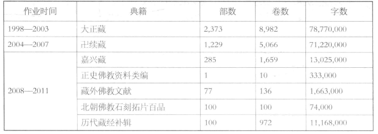 CBETA(Chinese Buddhist Electronic Text Association,中华电子佛典协会),成立于1998年,旨在收集所有的汉文佛典,以建立电子佛典集成;研发佛典电子化技术,提升佛典交流与应用;利用电子媒体之特性,以利佛典保存与流通;期望让任何想要阅藏的人都有机会如愿以偿[8]。目前,已完成数字化的典籍如表3-2所示。在2016年6月发布的佛典集成最新版中,将增加“大藏经补编”(共36册,约2300万字)和佛寺志(15部,约145万字)[9]。