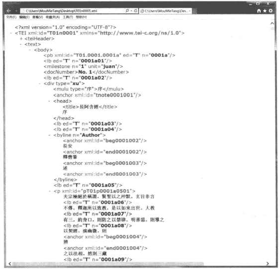 XML版本基于TEI[14]指南(P5版本),此为CBETA佛典电子化工程的一个重大里程碑,如图3-3所示。该版本的内码全部使用统一码(Unicode),Unicode中没有对应的汉字,则使用TEI“缺字”(gaiji)模块,能让每个单一字符与国际开放标准相符合,如此更有利于进行文献互换,并可由所有符合XML的工具加以处理。整套的档案说明文件使用标准TEIODD引伸机制,并且依照三种文件定义语言的定义(DTD语言,W3CSchema语言,RelaxNG)[15]。