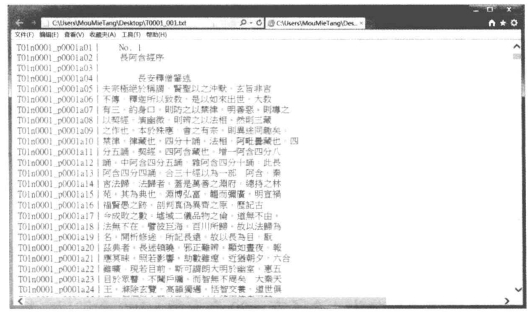 普及版为一般文本文件的格式,可利用任何支持中文BIG5码的文本编辑器或是浏览器阅读编辑;直接使用“【图】”来表示《大正藏》原书中的图形;使用“◇”来表示单一梵文悉昙字,“【◇】”则表示二个字以上连续的梵文悉昙字[12];每行经文之前的行首信息《大正藏》作“Txn“o”yyyyopzzzzal”,“T”表示大正藏(Taisho)经文,“x”表示册数,“n”固定不变(表示后面接经号) ,“yyyy”表示大正藏经号,大写之A、B ⋯表示《大正藏》有记载之同经号之别本,小写之a、b⋯⋯表示《大正藏》没有记载之同经号之别本,“_”表示完全没有同经号资料者,“p”固定不变(表示后面接页码) ,“zzzz”表示页码,“a”表示第几栏,a表示上栏,b表示中栏,c表示下栏,“l ”表示在该栏的行数[13]。如图3-2所示。