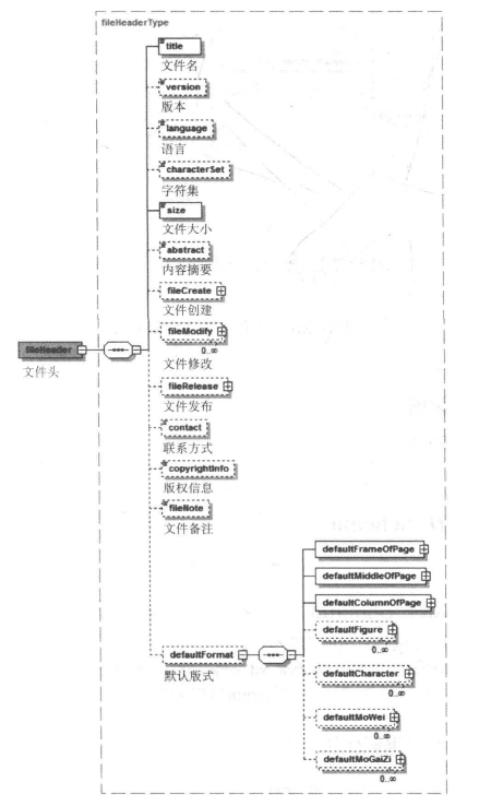 叶文件XML由三部分组成,包括文件头、叶文本数据和集外字数据,如图5-21所示,使用fileHeader(文件头)、pageText(叶文本)、gaijiList(外字列表)等标签描述。文件头是位置文本XML的整体属性说明和创建、修改、发布等过程描述;叶文本数据是版式文本XML的核心部分,以叶为单位,包含简单对象和复杂对象的XML描述;集外字数据是版式文本XML的补充说明,针对文本数据中的集外字。