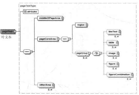 叶文本数据是版式文本XML的核心部分,以叶为单位,将每一叶分为版心区、叶核心区(版框内除去版心的部分)和其他区三部分,包含古籍每一叶的内容信息和版式信息,如图5-23所示,使用middleOfPageArea(版心区)、pageCoreArea(叶核心区)、otherArea(其他区)、region(区域)、lineText(文本行)、table(表格)、image(图像)、figure(图形)、figureCombination(图形组合)等标签描述。