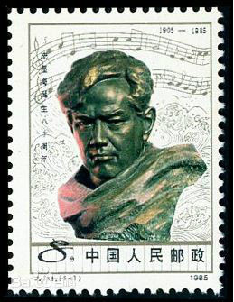 1985年6月13日我国发行《J111 冼星海诞生八十周年》,纪念冼星海先生名称是冼星海诞生八十周年,版别为影写版,全套枚数1,全套面值0.08元,发行机构邮电部,原作者曹崇恩志编号J111。整版枚数50(10×5)。发行日期1985-6-13,全套售价0.08元,印制机构北京邮票厂,设计者陈晓聪。