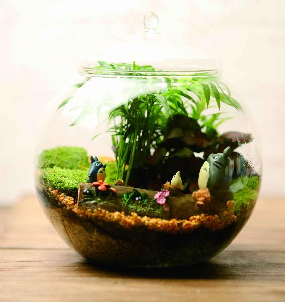 缸形玻璃花器1个,树脂卡通、碎石、苔藓、碎石、植物各适量。