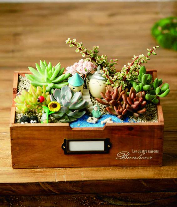 屉形木质花器1个,树脂卡通、彩砂、碎石、金枝玉叶等多肉植物各适量。