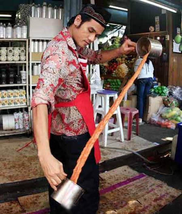 茶博士的倒茶表演堪称一种纯熟的技艺。茶博士一手拿着个大茶罐,一手拿着茶杯,一上一下,两手间隔1米左右。他们将奶茶从大茶罐里倒进茶杯里,再从茶杯倒回大茶罐里,这样反复7次,就意味着红茶与牛奶互相融合一体了,这种倒茶表演是一种高超的技艺,在反复倒茶的过程中,奶茶半点都不会外溢,更不会飞溅到茶客的身上,因之许多饮茶客与其说是来喝茶,莫如说是来观赏茶艺表演的。