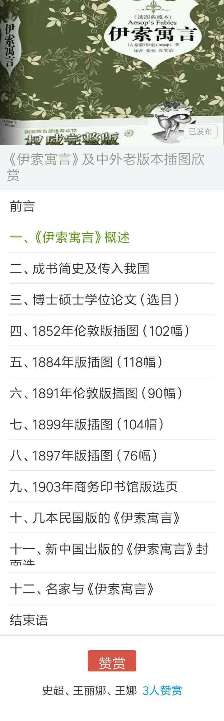 开篇说过,我做的第一个专题是摸索着做的。有了点经验后,我又在手机上做了第二个专题《伊索寓言及中外老版本插图欣赏》。