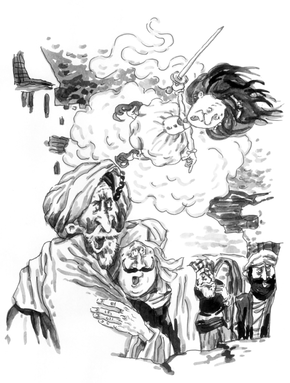 魂不守舍的商人想到过一会儿自己就要变成妖怪的刀下鬼,不觉心惊肉跳,像热锅上的蚂蚁似的坐立不安,情急中竟昏过去好长时间。醒来后,他又发现一个带着两条黑色纯种猎狗的老人来到花园。后者打过招呼,问他俩为何坐在这妖魔鬼怪经常出没的地方。两人又将故事从头到尾讲了一遍。刚来的老人还未坐定,那边又走来一个牵着一匹花斑骡子的老人。他问了和前两位老人同样的问题,听清了来龙去脉后,也和他们坐在一起。四人还未来得及说什么,荒野中猛然间一阵狂风袭来,卷起漫天尘土。尘土稍落,只见那妖怪手中利剑脱鞘,眼里喷着火花,直奔他们而来。他将商人从他们当中一把揪出,吼道: