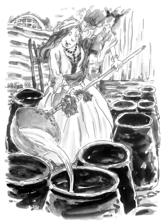 麦尔加娜走到最后一个坛子前,发现里面装的是油,于是弄了一满罐子油,回到厨房,给灯添上油,然后取来油锅,将罐子里的油倒进锅里,架在火上将油烧开。之后,她把滚烫的油装在罐子里,走去给每个坛子里浇进一瓢沸油,藏在坛子里的盗匪们一一被烫死,无一能够幸免。