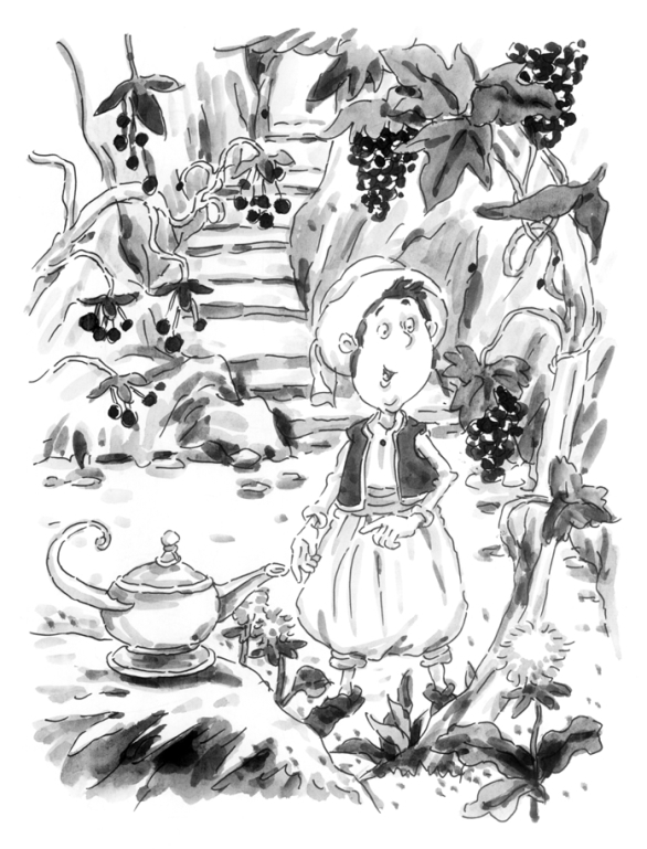 阿拉丁怕耽搁太久,魔法师会骂他,便急急忙忙地踏上了回去的路。他来到洞口,高声喊道: