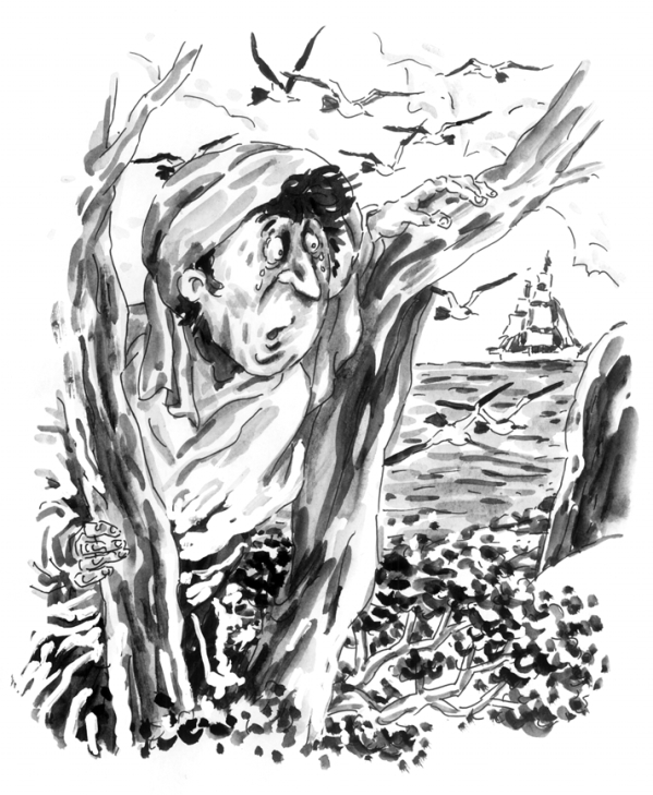 没有一个商人或海员提醒我,他们把我一个人扔在了岛上,我左顾右盼,除了我没有任何人,我越想越伤心,由于过于悲痛和劳累我几乎崩溃,我身边没有吃的也没有喝的,对活命我心灰意冷,我对自己说:不可能每次都平安走运,第一次有人救了我,我平安了,这一次就很难遇到救我的人了。我开始号啕大哭,我责备自己在家中过着舒适的生活,吃最好的,穿最好的,干吗又跑出来旅行。我既不缺钱,也不缺任何东西。我后悔第一次旅行受尽艰辛之后,我又再次离开巴格达去航海。我对自己说:我本属于安拉,终归要回到他那儿去。我变得疯了一般,而后,我站起身来,在岛上四处走,我在一个地方坐不住,便爬到一棵高树上张望,除了天空、水、树、鸟和沙子之外,我什么也没看见。我又仔细看看,发现远处有个很大的白色物体,就在岛上。我从树上下来,朝着那个物体走去。我一直走到跟前,原来是个白色的圆顶建筑,很高很大,我靠近了,围着它转,没找到门,太滑也爬不上去。我记准了所站的位置,然后绕着这大顶转,量它的圆周,足足有五十步,我一直在想怎么才能进到里面去。