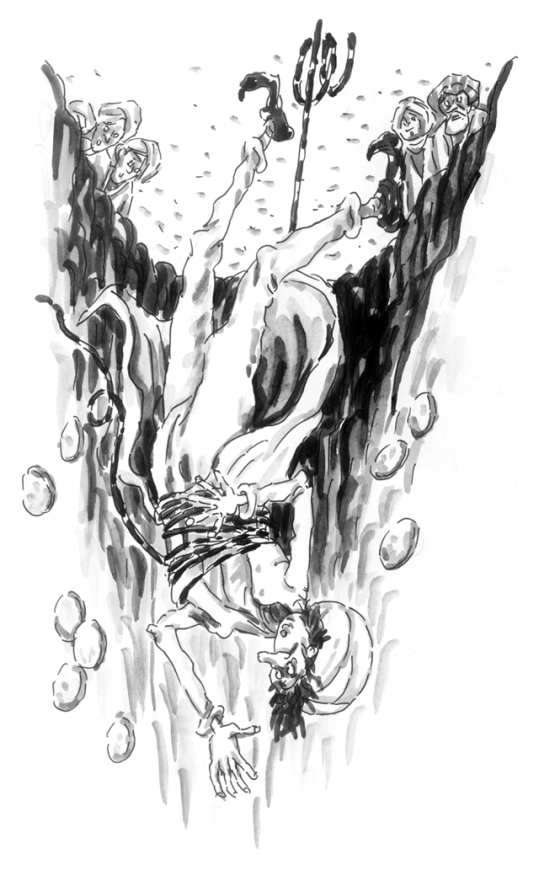 我们正说着,城里的父老乡亲都来了,不仅吊唁他的妻子,也对他本人表示哀悼,并开始为埋葬他们两人做准备。他们抬来了一个大棺材,把他们两人装进去,然后把他俩抬到靠海的山坡上。他们来到一处地方,揭开一块大石头盖子,露出一个井口似的大口子,其实是山下的一个大坑。他们先把死了的妻子的尸体扔下坑,然后把活着的丈夫带过来,在他身上绑上一根绳子,然后把他放下坑去。他们给了他一大罐淡水和七块饼,然后把绳子解掉,并用原先的那块大石头把坑口给盖上,就让我那可怜的朋友在他死去的妻子身边等死了!我想,这活着的朋友要等死可比他妻子要难多了。于是,我就面见国王,问他为什么活人要同死人一起埋。国王告诉我,这是这个国家的习惯,以便使恩爱夫妻生在一起,死也为伴,永不分离。我就问道:“像我这样的外乡人如果妻子死了,你们是否也会这样对待我?”