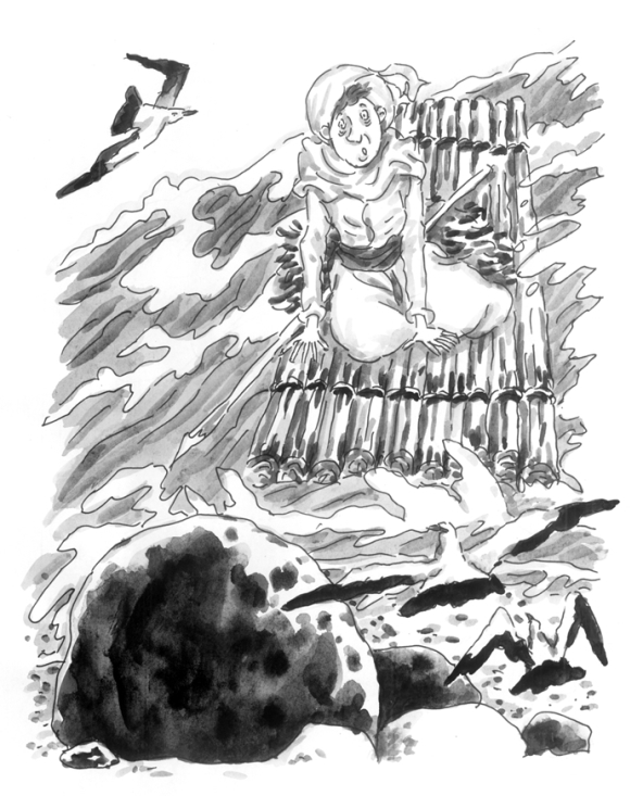 我开始收集木头,包括中国筷子和沉香木,并用破船上的绳子将它们捆绑在一起,我又从破船上取来大小差不多的木板,把它们拼好后就放进河里。我从岛上取来矿石、珠宝、钱财、珍珠、龙涎香及剩下的食物等物品,并把它们装在两个大木箱子里,搬上小木筏,然后我就乘着这个小木筏顺流而下了。木筏这样顺流而行,我也懒得考虑它究竟要带我去往何方。过了不久,我就来到了山脚下,天已经完全黑下来了。小筏进了一个小峡谷,我都能听见小筏四周的撞击声,我的头也快撞到山上了,而顺流而下的小筏是不可能掉头逆行的了。我又开始责怪自己,心想要是这小筏过不了这峡谷,我可要惨死在这里了。由于峡谷很窄,天又黑,我只好把脸朝下趴在小筏上,随着这筏白天黑夜地向下游流去,我心里充满了对死亡的恐惧。