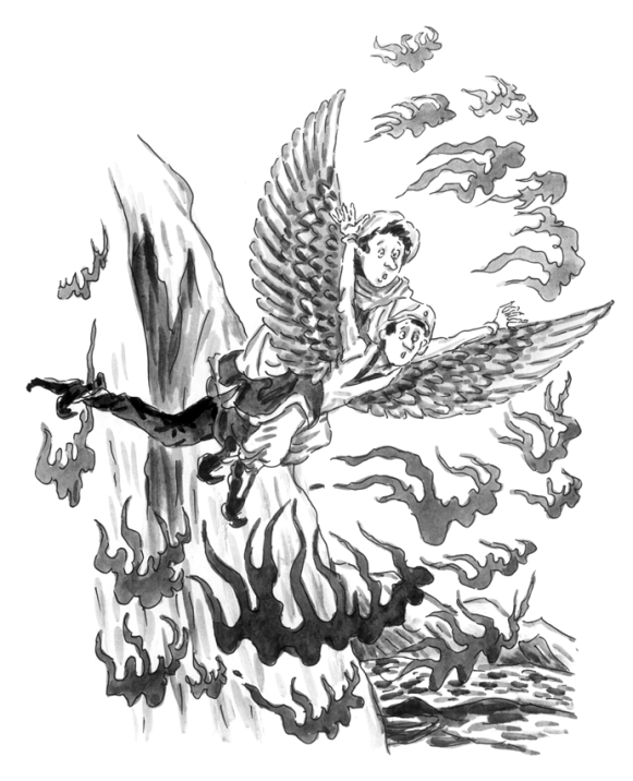 我话音未落,天空出现一团火,几乎烧着他们,他们全部都落下来了,把我扔在了一座高山上,他们很生我的气,把我一个人留在那儿,他们都走了。我责怪自己不该那么做。我说:“万般无奈,只有靠安拉了,每当我摆脱一个灾难,我就陷入另一个更大的灾难。”我一直待在那个山上,不知道该上哪儿去……后来走来了两个年轻人,就像两轮月亮,他们每人手里拄着根金棒,我走上前去向他们问好,他们应答了问候,我对他们说:“你们是谁,干吗的?”