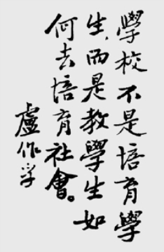 中国教育一直存在着读死书、死读书的模式,湮没人的性灵,培养出来的“人才”多是于世无用、于事无补的酒囊饭袋。自学成才的卢作孚对教育有独特理解:“事业实即教育,且为最实际的学校”,这样的观点在中国教育史上实属凤毛麟角。他教人从实际生活上去学习:“学骑马,要在马上学;学游泳,要在水上学;学用机器,要在机器面前学。”他说:“最好的教师是,在他眼里,个个学生是天才,关键是教师如何去帮助发展,要帮助学生自己学习和自行解决问题。”并希望教育从小学起,把如一张白纸的儿童,一直教好下去,不要教“死”人,甚至教成坏人。