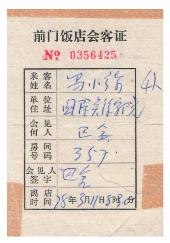 偶然在书堆中发现了这张当年的会客证。当年北京各大宾馆门禁森严,会客制度严格如衙门一般。